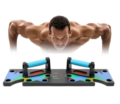 Verschillende kleur-gecodeerde push-up bord richt zich op specifieke spieren gewerkt, oefeningen borst- en buikspieren, armspieren en latissimus dorsi, de kleurcodes zijn (Rood-schouders, Blauw-borst, Gele rug, en Groen-triceps).